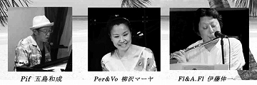 伊藤伸一(fl&a.fl) 五島和成(pf) マーヤ柳澤(perc&vo) | ①19:30~ | 税込C:2800 + 2 オーダー |